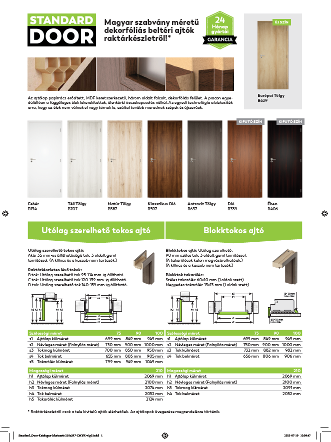 Beltéri ajtókat 6 féle népszerű színben forgalmazzuk. Tele ajtólapos kivitelben raktárkészletről elérhetők, 75x210cm, 90x210cm, és 100x210cm méretekben.